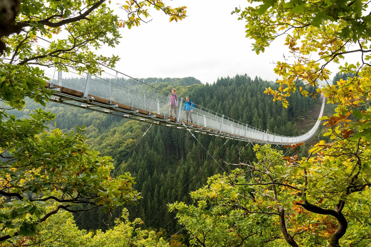 Geierlay, die schönste Hängeseilbrücke Deutschlands, mitten im Hunsrück. Dieses beeindruckende Bauwerk überspannt das Tal zwischen Sosberg und Mörsdorf. Beim Gang über die Brücke erlebt man einzigartige Weitblicke in den Hunsrück.