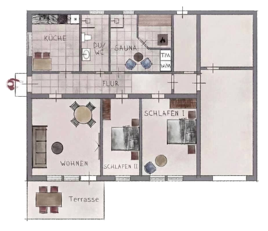 Die Ferienwohnung mit 73 m² Wohnfläche bietet Platz für bis zu 4 Personen und verfügt über einen eigenen separaten Eingang sowie eine private Terrasse, die maximale Privatsphäre garantiert. Durch die ruhige Lage eignet sich das Apartment besonders für Gäste, die Entspannung und Erholung suchen.