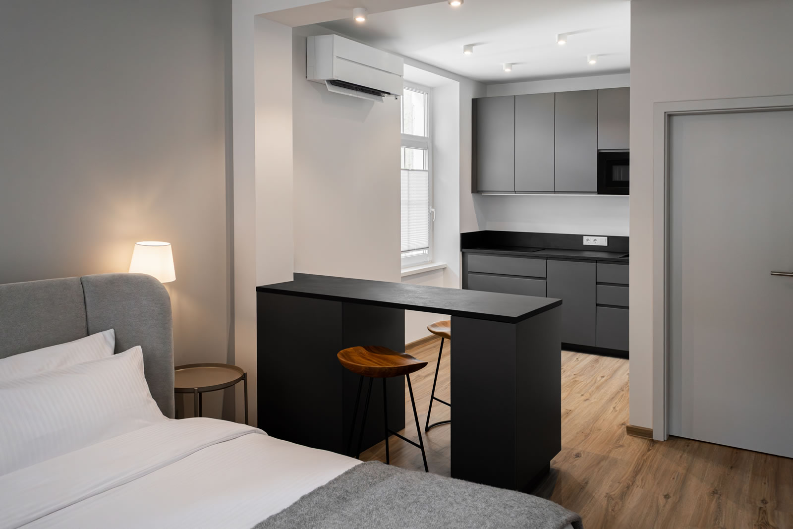 Großes Doppelbett (180×200 cm), Smart-TV, Kleiderschrank und gemütliche Sitzecke.